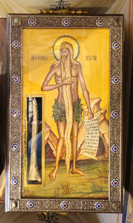 Мощи прп. Онуфрия Великого находятся в нише западной стены Петро-Павловского придела Преображенского храма.